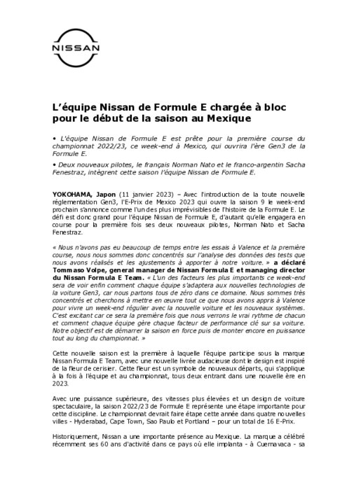 Avec l'introduction de la toute nouvelle réglementation Gen3, l'E-Prix de Mexico 2023 qui ouvre la saison 9 le week-end prochain s'annonce comme l'un des plus imprévisibles de l'histoire de la Formule E. Le défi est donc grand pour l'équipe Nissan de Formule E, d'autant qu'elle engagera en course pour la première fois ses deux nouveaux pilotes, Norman Nato et Sacha Fenestraz.