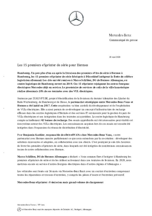 Les 15 premiers eSprinter de série pour Hermes