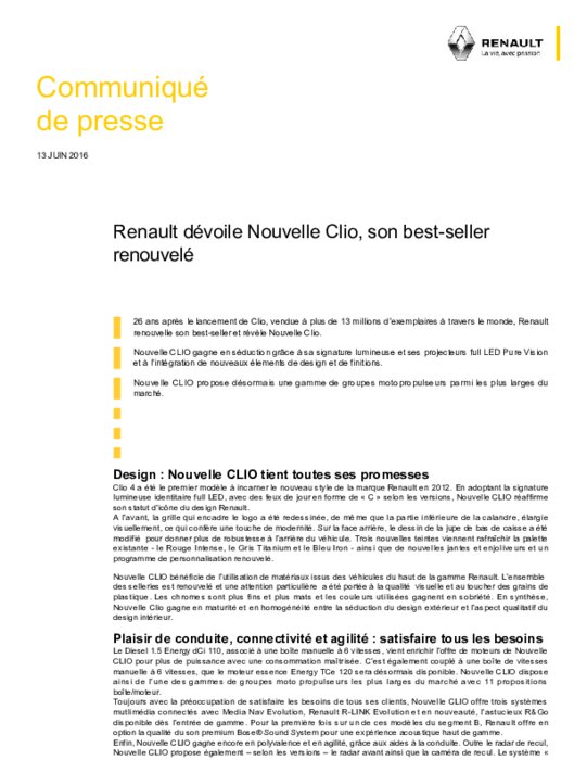 26 ans après le lancement de Clio, vendue à plus de 13 millions d’exemplaires à travers le monde, Renault renouvelle son best-seller et révèle Nouvelle Clio. Nouvelle Clio gagne en séduction grâce à sa signature lumineuse et ses projecteurs full LED Pure Vision et à l’intégration de nouveaux éléments de design et de finitions. Nouvelle Clio propose désormais une gamme de groupes motopropulseurs parmi les plus larges du marché.