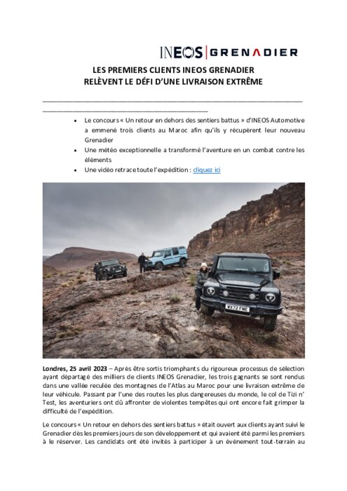 Après être sortis triomphants du rigoureux processus de sélection ayant départagé des milliers de clients INEOS Grenadier, les trois gagnants se sont rendus dans une vallée reculée des montagnes de l’Atlas au Maroc pour une livraison extrême de leur véhicule. Passant par l’une des routes les plus dangereuses du monde, le col de Tizi n’ Test, les aventuriers ont dû affronter de violentes tempêtes qui ont encore fait grimper la difficulté de l’expédition.