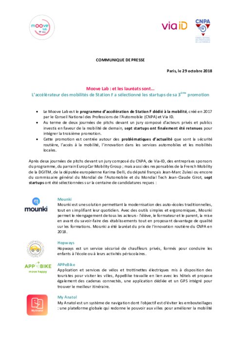 Le Moove Lab est le programme d’accélération de Station F dédié à la mobilité, créé en 2017 par le Conseil National des Professions de l’Automobile (CNPA) et Via ID. Au terme de deux journées de pitchs devant un jury composé d’acteurs privés et publics investis en faveur de la mobilité de demain, sept startups ont finalement été retenues pour intégrer la troisième promotion.