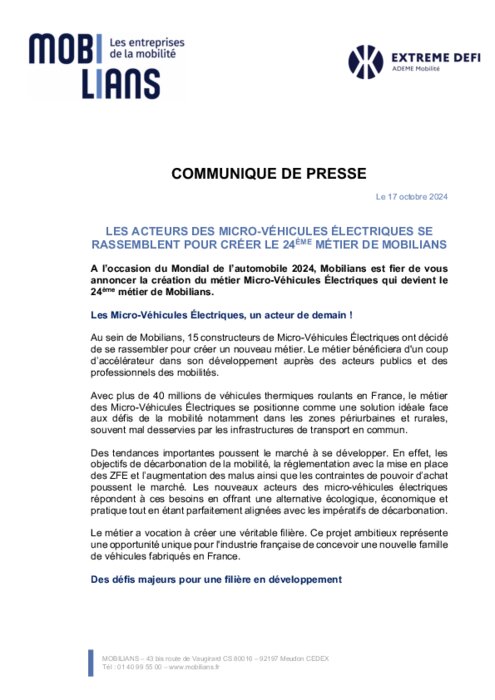 Au sein de Mobilians, 15 constructeurs de Micro-Véhicules Électriques ont décidé de se rassembler pour créer un nouveau métier. Le métier bénéficiera d'un coup d’accélérateur dans son développement auprès des acteurs publics et des professionnels des mobilités.