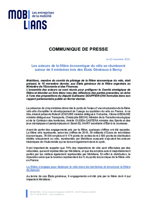 Mobilians, membre du comité de pilotage de la filière économique du vélo, était présent, le 15 novembre dernier, aux États généraux de la filière organisés au Ministère de l’Economie et des Finances. L’ensemble des acteurs se sont réunis pour préfigurer le Comité stratégique de filière et dévoiler un livre blanc issu des réflexions des parties prenantes, en écho à l’une des propositions du député Guillaume GOUFFIER-CHA formulée dans son rapport parlementaire publié en février dernier.