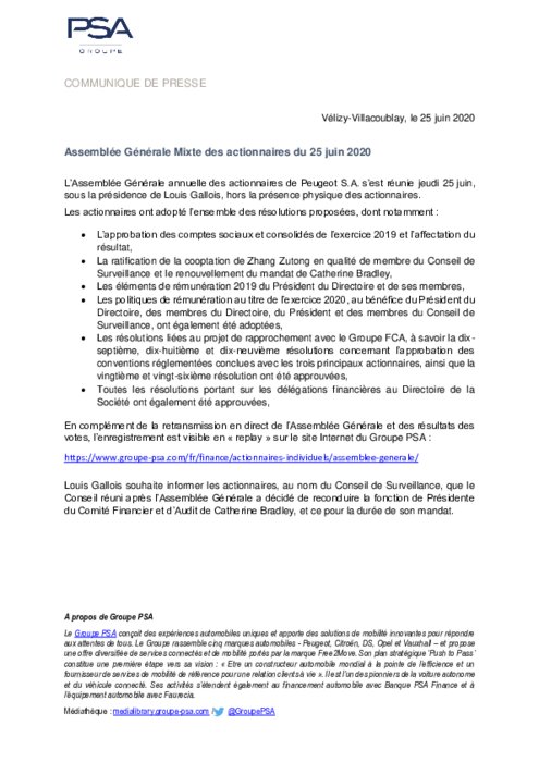 Les actionnaires du constructeur automobile français PSA (Peugeot, Citroën) ont conforté jeudi lors de leur assemblée générale annuelle l'option stratégique d'une fusion avec Fiat Chrysler (FCA) signée en décembre par les deux groupes.