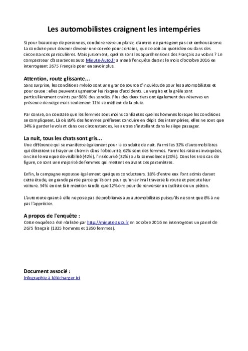 Si pour beaucoup de personnes, conduire reste un plaisir, d'autres ne partagent pas cet enthousiasme. La conduite peut devenir devenir une corvée pour certains, que ce soit au quotidien ou dans des circonstances particulières. Mais justement, quelles sont les appréhensions des Français au volant ? Le comparateur d'assurances auto Minute-Auto.fr a mené l'enquête durant le mois d'octobre 2016 en interrogeant 2675 Français pour en savoir plus.