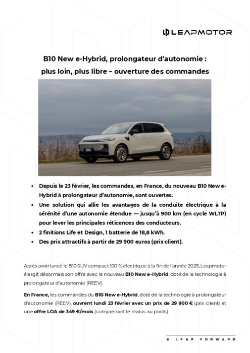 Constructeurs 24 février 2026 - 14:29 Après avoir lancé le B10 SUV compact 100 % électrique à la fin de l’année 2025, Leapmotor élargit désormais son offre avec le nouveau B10 New e-Hybrid, doté de la technologie à prolongateur d’autonomie (REEV). PDF (247 Ko) Télécharger credit Leapmotor