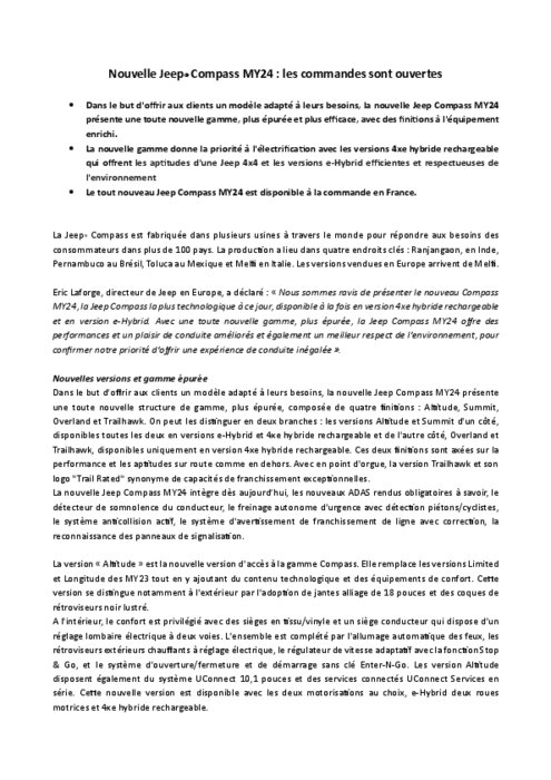 La nouvelle gamme donne la priorité à l'électrification avec les versions 4xe hybride rechargeable qui offrent les aptitudes d'une Jeep 4x4 et les versions e-Hybrid efficientes et respectueuses de l'environnement. Le tout nouveau Jeep Compass MY24 est disponible à la commande en France.