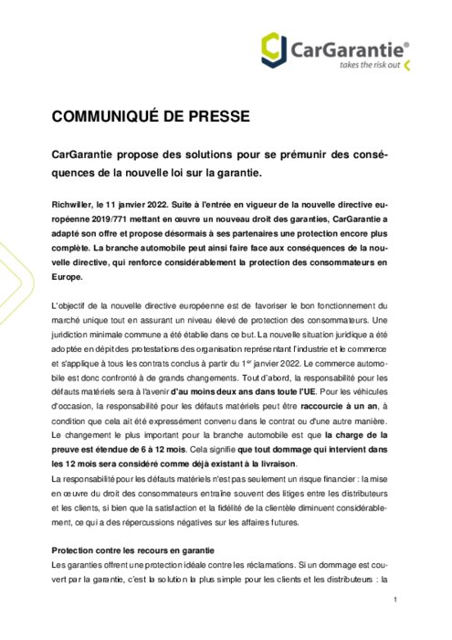 Suite à l'entrée en vigueur de la nouvelle directive européenne 2019/771 mettant en œuvre un nouveau droit des garanties, CarGarantie a adapté son offre et propose désormais à ses partenaires une protection encore plus complète. La branche automobile peut ainsi faire face aux conséquences de la nouvelle directive, qui renforce considérablement la protection des consommateurs en Europe.