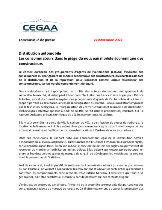 Le conseil européen des groupements d’agents de l’automobile (CEGAA) s’inquiète des conséquences du changement de modèle économique des constructeurs, qui écarte les acteurs de la distribution et de la réparation, pour s'imposer comme unique fournisseur des consommateurs, sur un marché complètement dérégulé.