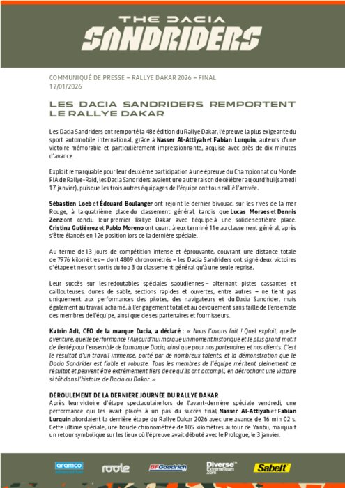 Les Dacia Sandriders ont remporté la 48e édition du Rallye Dakar, l’épreuve la plus exigeante du sport automobile international, grâce à Nasser Al-Attiyahet Fabian Lurquin, auteurs d’une victoire mémorable et particulièrement impressionnante, acquise avec près de dix minutes d’avance.