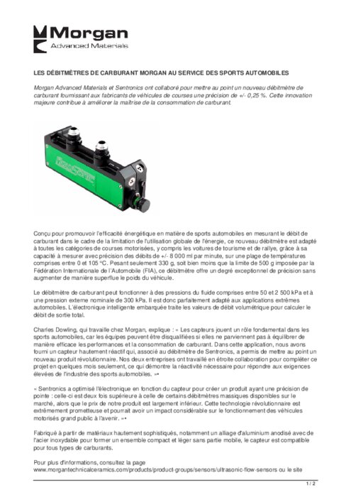 Morgan Advanced Materials et Sentronics ont collaboré pour mettre au point un nouveau débitmètre de carburant fournissant aux fabricants de véhicules de courses une précision de +/- 0,25 %. Cette innovation majeure contribue à améliorer la maîtrise de la consommation de carburant.