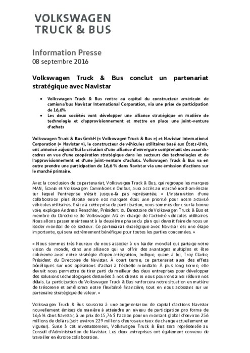 Volkswagen Truck & Bus (« Volkswagen Truck & Bus ») et Navistar International Corporation (« Navistar »), le constructeur de véhicules utilitaires basé aux États-Unis, ont annoncé la création d'une alliance d’envergure comprenant des accords-cadres en vue d'une coopération stratégique dans les secteurs des technologies et de l'approvisionnement et d’une joint-venture d'achats. Volkswagen Truck & Bus va en outre prendre une participation de 16,6 % dans Navistar.