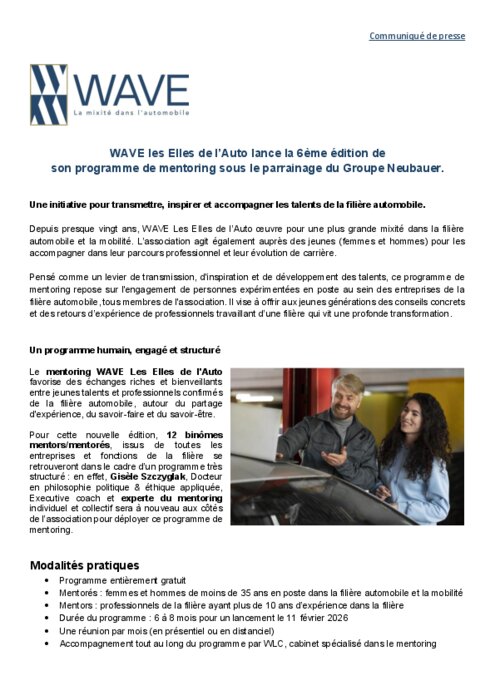 Depuis presque vingt ans, WAVE Les Elles de l’Auto œuvre pour une plus grande mixité dans la filière automobile et la mobilité. L’association agitégalement auprès des jeunes (femmes et hommes) pour les accompagnerdans leur parcours professionnel et leur évolution de carrière. Pensé comme un levier de transmission, d'inspiration et de développement des talents, ce programme de mentoringrepose sur l'engagement de personnes expérimentées en poste au sein des entreprises de la filière automobile, tous membres de l'association. Il vise à offrir aux jeunes générationsdes conseils concretsetdes retours d’expérience de professionnels travaillant d’une filièrequi vit une profonde transformation.