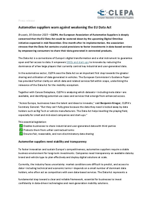 La CLEPA, l'association européenne des équipementiers automobiles, est profondément préoccupée par le fait que la loi européenne sur les données pourrait être édulcorée par la prochaine initiative Digital Omnibus prévue pour la mi-novembre. Un mois après sa mise en œuvre, l'association souligne que la loi sur les données contient des dispositions cruciales pour encourager les investissements dans les services basés sur les données en donnant aux consommateurs la possibilité de partager les données générées par les produits connectés.
