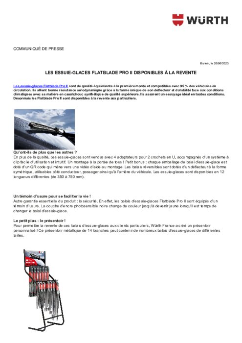 Les essuie-glaces Flatblade Pro II sont de qualité équivalente à la première monte et compatibles avec 95 % des véhicules en circulation. Ils allient bonne résistance aérodynamique grâce à la forme unique de son déflecteur et durabilité face aux conditions climatiques avec sa matière en caoutchouc synthétique de qualité supérieure. Ils assurent un essuyage idéal en toutes conditions. Désormais les Flatblade Pro II sont disponibles à la revente aux particuliers.