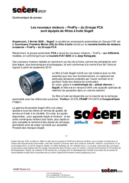 Equipementiers 03 février 2020 - 09:31 Sogefi, la société de composants automobiles du Groupe CIR, est le fournisseur Première Monte (OE) du filtre à huile monté sur la nouvelle famille de moteurs à essence " FireFly " du Groupe FCA. PDF (224 Ko) Télécharger