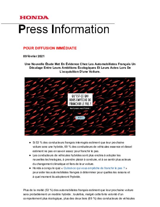 Honda constate que plus de la moitié (53 %) des automobilistes français estiment que leur prochaine voiture sera probablement un modèle hybride ; toutefois, malgré cette forte volonté d’un comportement plus écologique, plus des deux tiers (69 %) des conducteurs de véhicules essence et diesel ont le sentiment de ne pas en savoir assez pour franchir le pas.