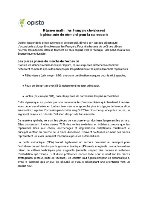 Opisto, leader de la pièce automobile de réemploi, dévoile son top des pièces auto d’occasion les plus plébiscitées par les Français. Face à la hausse du coût des pièces neuves, les automobilistes se tournent de plus en plus vers le réemploi, une solution à la fois économique et durable.