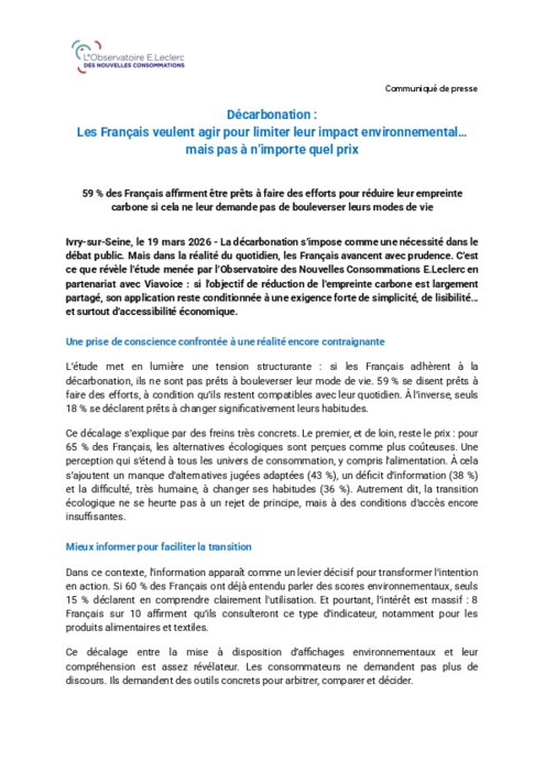 La décarbonation s’impose comme une nécessité dans le débat public. Mais dans la réalité du quotidien, les Français avancent avec prudence. C’est ce que révèle l’étude menée par l’Observatoire des Nouvelles Consommations E.Leclercen partenariat avec Viavoice : si l’objectif de réduction de l’empreinte carbone est largement partagé, son application reste conditionnée à une exigence forte de simplicité, de lisibilité… et surtout d’accessibilité économique.