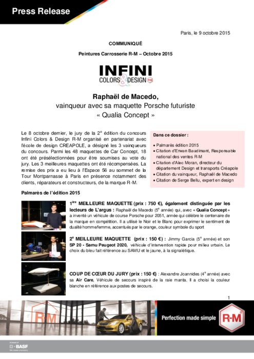 Le jeudi 8 octobre, le jury de la 2è édition du concours Infini Colors & Design R-M organisé en partenariat avec l’école de design CREAPOLE, a désigné, en présence de l'écrivain Serge Bellu et de nombreux membres R-M, les 3 vainqueurs du concours. Parmi les 48 maquettes de Car Concept, 18 ont été présélectionnées pour être soumises au vote du jury. Les 3 meilleures maquettes ont été récompensées. La remise des prix a eu lieu à l’Espace 56 au sommet de la Tour Montparnasse à Paris.