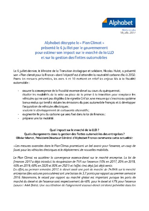 Le 6 juillet dernier, le Ministre de la Transition écologique et solidaire, Nicolas Hulot, a présenté son « Plan climat pour la France » dont l’objectif est d’atteindre la neutralité carbone d’ici à 2050. Parmi les mesures présentées, les axes 4 et 10 mettent en relief les enjeux liés à la fiscalité automobile. Quel impact sur le marché de la LLD ? Quels changements dans la gestion des flottes automobiles des entreprises ? Olivier Monot, Président-DG d’Alphabet France commente cette actualité.
