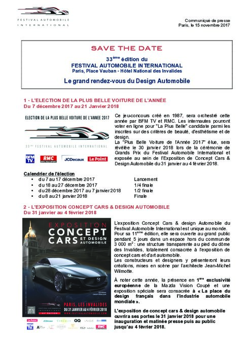Ce jeu-concours créé en 1987 sera orchestré cette année par BFM TV et RMC. Les internautes pourront voter en ligne pour "La Plus Belle" candidate parmi les inscrites sur des critères de beauté, d'esthétisme et de design. La "Plus Belle Voiture de l'Année 2017" élue, sera révélée le 30 janvier 2018 lors de la cérémonie de Grands Prix du Festival Automobile International et exposée au sein de l'Exposition de Concept Cars & Design Automobile du 31 janvier au 4 février 2018.