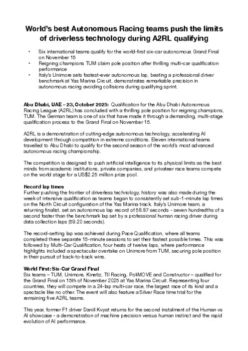 Les qualifications pour l'Abu Dhabi Autonomous Racing League (A2RL) se sont terminées par une pole position palpitante pour les champions en titre, TUM. L'équipe allemande est l'une des six équipes à avoir passé avec succès un processus de qualification exigeant en plusieurs étapes pour accéder à la grande finale du 15 novembre.