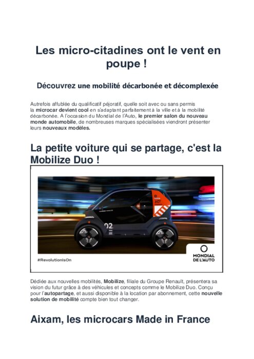 Autrefois affublée du qualificatif péjoratif, quelle soit avec ou sans permis la microcar devient cool en s’adaptant parfaitement à la ville et à la mobilité décarbonée. A l’occasion du Mondial de l’Auto, le premier salon du nouveau monde automobile, de nombreuses marques spécialisées viendront présenter leurs nouveaux modèles.