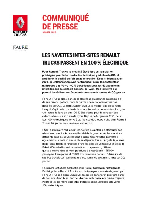 Pour Renault Trucks, la mobilité électrique est la solution privilégiée pour lutter contre les émissions globales de CO2 et améliorer la qualité de l’air en zone urbaine. Depuis début janvier 2021, en collaboration avec l’entreprise Faure, le constructeur utilise des bus Volvo 100 % électriques pour les déplacements inter-sites des salariés de son site de Lyon. Une initiative qui permet de réaliser une économie de soixante tonnes de CO2 par an.