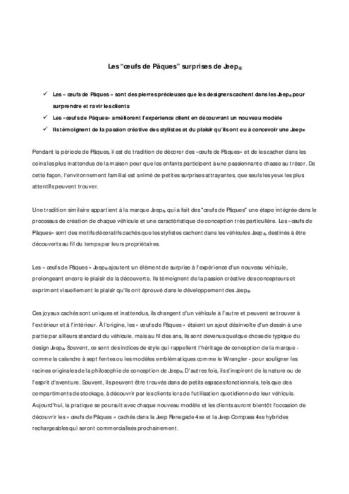 Les " œufs de Pâques " sont des pierres précieuses que les designers cachent dans les Jeep pour surprendre et ravir les clients. Les " œufs de Pâques» améliorent l'expérience client en découvrant un nouveau modèle. Ils témoignent de la passion créative des stylistes et du plaisir qu'ils ont eu à concevoir une Jeep...