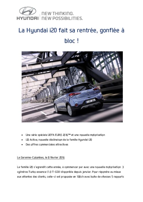 La famille i20 s’agrandit cette année, à commencer par avec une nouvelle motorisation 3 cylindres Turbo essence (1.0 T-GDi) disponible depuis janvier. Pour répondre au mieux aux attentes des clients, celle-ci est proposée en 100ch avec boite de vitesses 5 rapportsou en 120ch avec 6, alliant agréments de conduite et basse consommation (consommation moyenne de 3.6l/100km et des émissions de CO2 à partir de 99g/km).