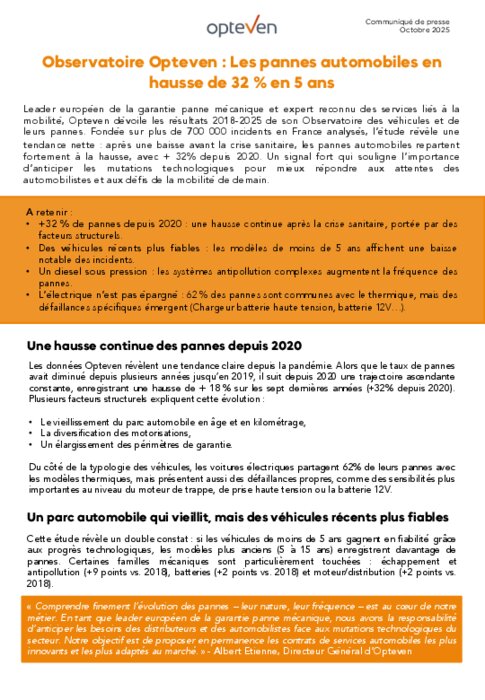 Leader européen de la garantie panne mécanique et expert reconnu des services liés à la mobilité, Opteven dévoile les résultats 2018-2025 de son Observatoire des véhicules et de leurs pannes. Fondée sur plus de 700 000 incidents en France analysés, l’étude révèle une tendance nette : après une baisse avant la crise sanitaire, les pannes automobiles repartent fortement à la hausse, avec + 32% depuis 2020. Un signal fort qui souligne l’importance d’anticiper les mutations technologiques pour mieux répondre aux attentes des automobilistes et aux défis de la mobilité de demain.
