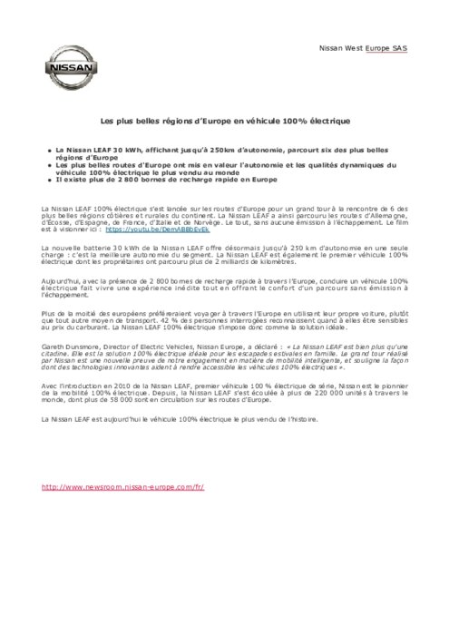 La Nissan LEAF 100% électrique s’est lancée sur les routes d’Europe pour un grand tour à la rencontre de 6 des plus belles régions côtières et rurales du continent. La Nissan LEAF a ainsi parcouru les routes d’Allemagne, d’Écosse, d’Espagne, de France, d’Italie et de Norvège. Le tout, sans aucune émission à l’échappement.