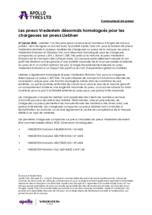Liebherr, l’un des principaux constructeurs mondiaux d’engins de travaux publics, vient de signer un accord avec la société Apollo Tyres Ltd. pour la livraison de pneus Vredestein destinés à plusieurs modèles de chargeuses sur pneus de la marque. Les pneus Vredestein Endurion et Flotation Trac sont désormais homologués pour les chargeuses compactes sur pneus L 504, L 506 et L 508. Très prisé sur le marché, le pneu Vredestein Endurion est le champion des surfaces dures...