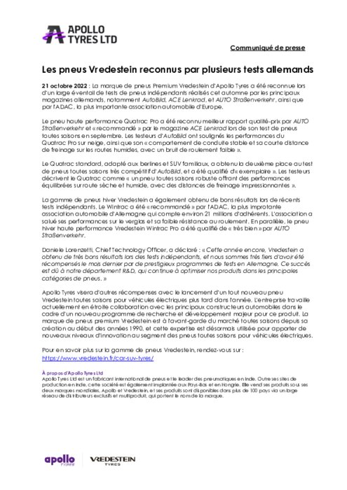 La marque de pneus Premium Vredestein d'Apollo Tyres a été reconnue lors d'un large éventail de tests de pneus indépendants réalisés cet automne par les principaux magazines allemands, notamment AutoBild, ACE Lenkrad, et AUTO Straßenverkehr, ainsi que par l'ADAC, la plus importante association automobile d'Europe.