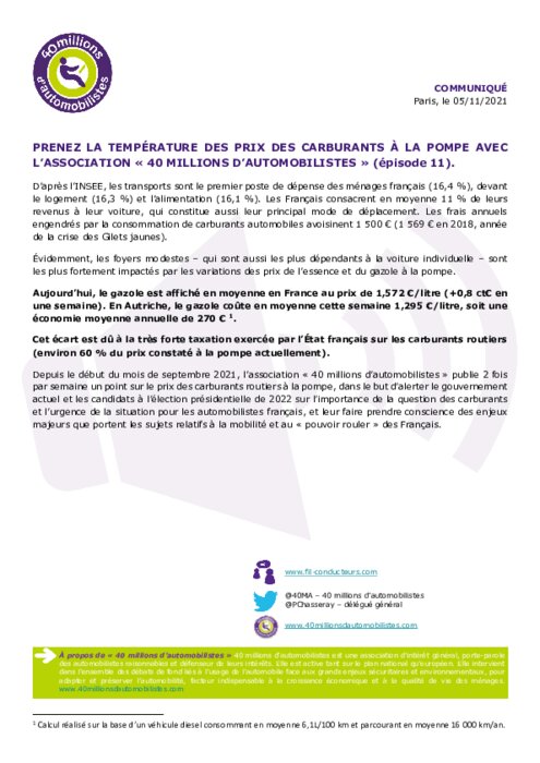Aujourd’hui, le gazole est affiché en moyenne en France au prix de 1,572 €/litre (+0,8 ct€ en une semaine). En Autriche, le gazole coûte en moyenne cette semaine 1,295 €/litre, soit une économie moyenne annuelle de 270 €. Cet écart est dû à la très forte taxation exercée par l’État français sur les carburants routiers (environ 60 % du prix constaté à la pompe actuellement).
