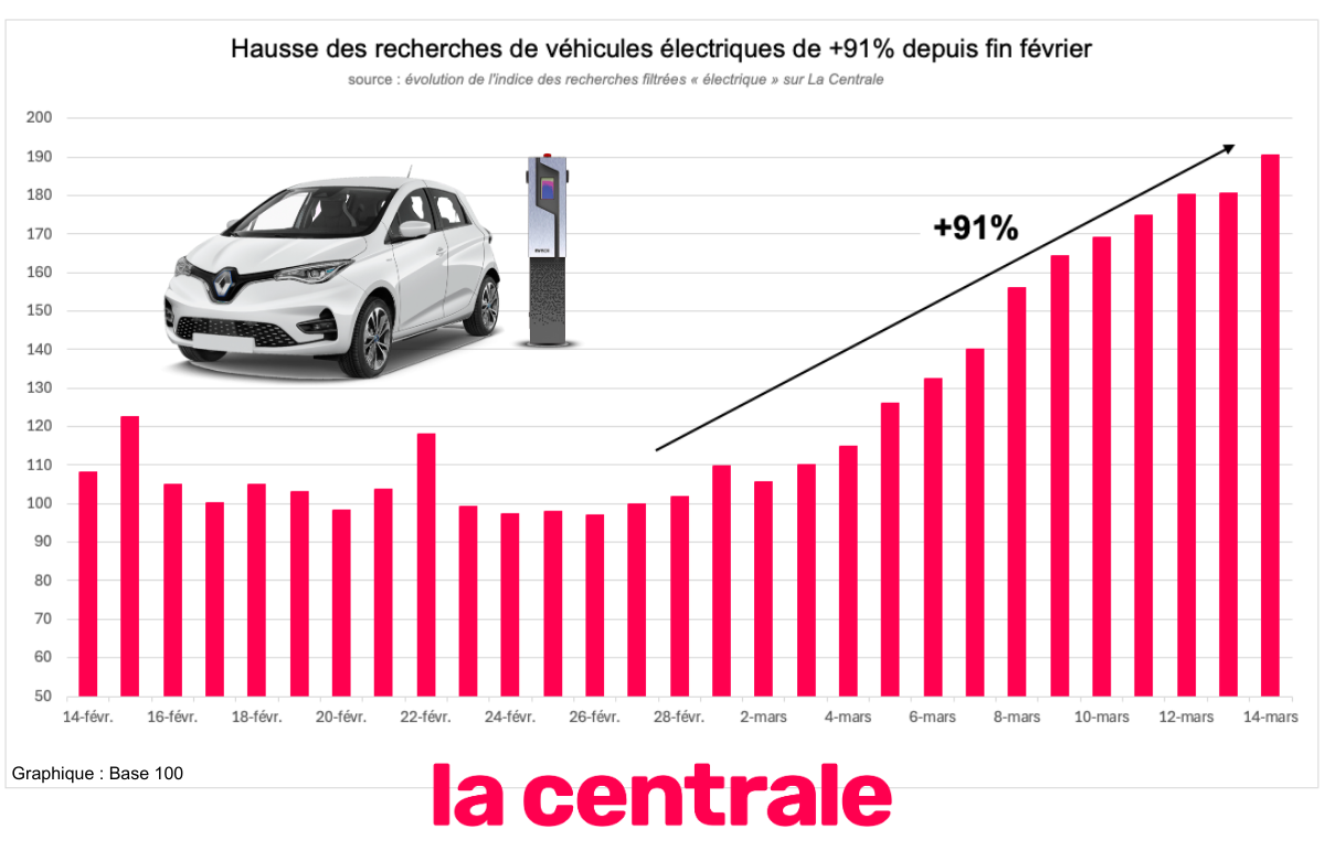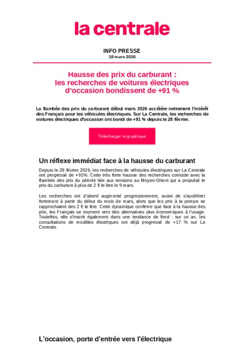 VO 18 mars 2026 - 10:18 La flambée des prix du carburant début mars 2026 accélère nettement l’intérêt des Français pour les véhicules électriques. Sur La Centrale, les recherches de voitures électriques d’occasion ont bondi de +91 % depuis le 28 février. PDF (109 Ko) Télécharger credit La Centrale