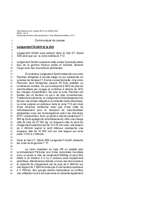 Langendorf sera présent dans le Hall 27, Stand 6 E06 ainsi que sur la zone extérieure T13 . Langendorf, exposera cette année 5 produits phare issus de la gamme travaux public et branche General 10 Cargo avec des innovations pertinentes. En extérieur Langendorf GmbH présente une smre 13 Flexliner réfrigérée à double étage ce qui représente en 14 volumes de transport 1,5 smre conventionnelle. Une smre 15 FlexLiner peut transporter jusqu'à 55 Euro palettes ou 16 conteneurs mobiles.