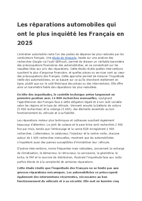 Les réparations automobiles qui ont le plus inquiété les Français en 2025 (étude de Winparts)
