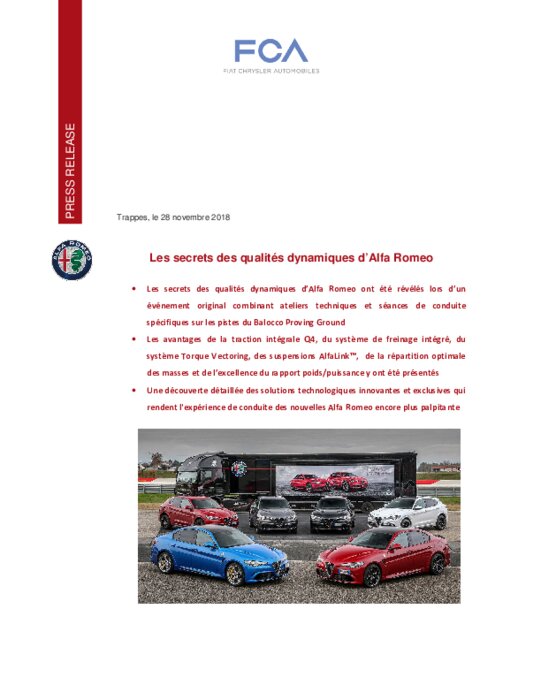 Alfa Romeo a dévoilé les secrets de la dynamique de conduite qui a fait sa renommée au travers de 4 ateliers techniques et de séances d’essais sur pistes. Ces sessions d’essais non conventionnelles se sont déroulées dans le cadre du centre expérimental du groupe FCA à Balocco, lieu où les technologies et les solutions d’ingénierie les plus novatrices ont été mises à l’épreuve et où la conduite des Giulia et Stelvio y est plus exaltante, en particulier avec les puissantes versions Quadrifoglio.