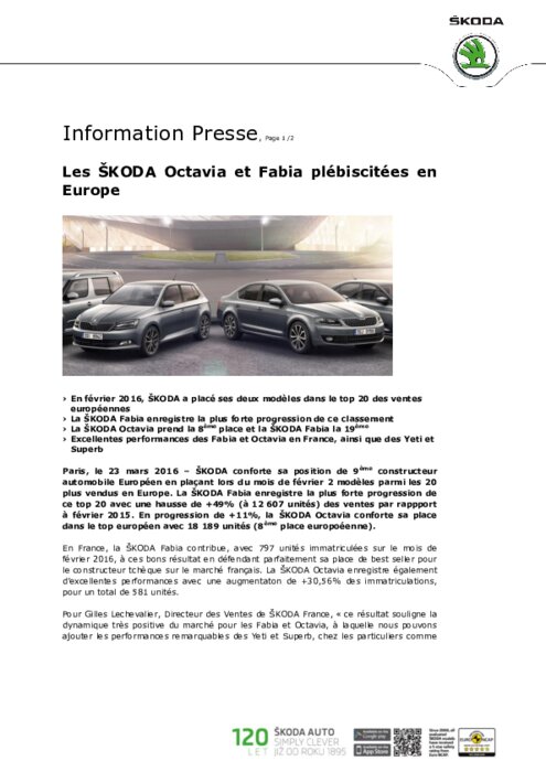 ŠKODA conforte sa position de 9ème constructeur automobile Européen en plaçant lors du mois de février 2 modèles parmi les 20 plus vendus en Europe. La ŠKODA Fabia enregistre la plus forte progression de ce top 20 avec une hausse de +49% (à 12 607 unités) des ventes par rappport à février 2015. En progression de +11%, la ŠKODA Octavia conforte sa place dans le top européen avec 18 189 unités (8ème place europoéenne).