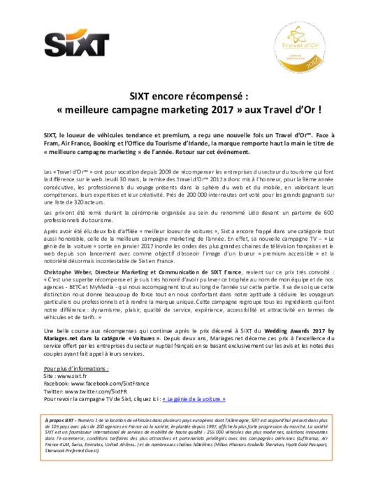 SIXT, le loueur de véhicules tendance et premium, a reçu une nouvelle fois un Travel d’Or. Face à Fram, Air France, Booking et l’Office du Tourisme d’Irlande, la marque remporte haut la main le titre de " meilleure campagne marketing " de l’année. Retour sur cet événement.