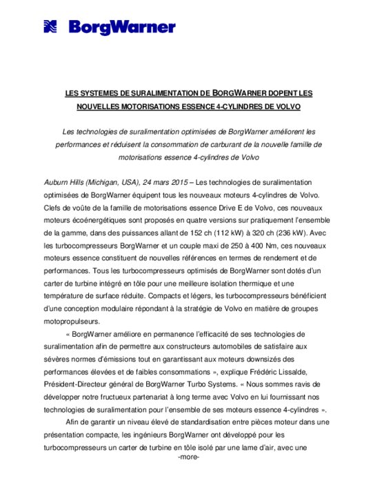 Equipementiers 24 mars 2015 - 17:04 BorgWarner améliorent les performances et réduisent la consommation de carburant de la nouvelle famille de motorisations essence 4-cylindres de Volvo. PDF (15 Ko) Télécharger