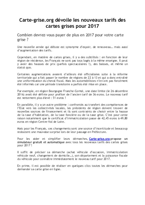 Pour aider et simplifier les démarche des conducteurs, Carte-grise.org propose un simulateur gratuit et automatique avec tous les nouveaux tarifs des cartes grises pour 2017 ! Il suffit de préciser sa démarche (achat véhicule d’occasion, immatriculation véhicule neuf, changement de domicile…), son département et la puissance fiscale du véhicule pour connaître immédiatement le nouveau tarif pour 2017.