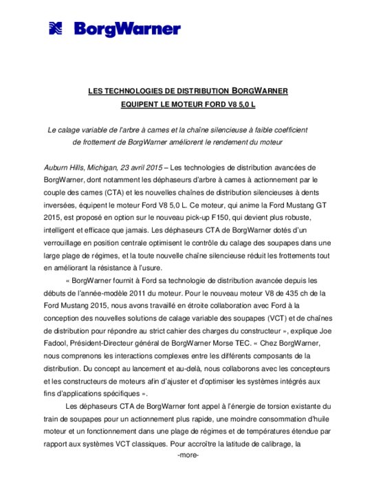 Les technologies de distribution avancées de BorgWarner, dont notamment les déphaseurs d’arbre à cames à actionnement par le couple des cames (CTA) et les nouvelles chaînes de distribution silencieuses à dents inversées, équipent le moteur Ford V8 5,0 L. Ce moteur, qui anime la Ford Mustang GT 2015, est proposé en option sur le nouveau pick-up F150, qui devient plus robuste, intelligent et efficace que jamais.