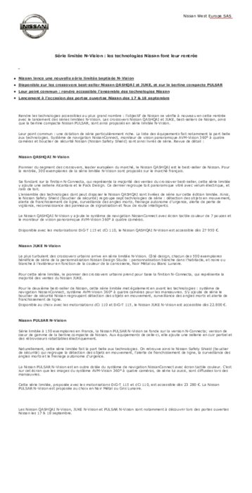 Rendre les technologies accessibles au plus grand nombre : l’objectif de Nissan se vérifie à nouveau en cette rentrée avec le lancement des séries limitées N-Vision. Les crossovers Nissan QASHQAI et JUKE, best-sellers de Nissan, ainsi que la berline compacte Nissan PULSAR, sont ainsi proposés en série limitée N-Vision.