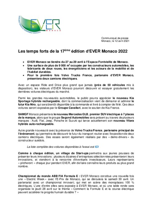 Avec un espace Ride and Drive plus grand que jamais (près de 50 véhicules mis à disposition), les visiteurs d’EVER Monaco pourront découvrir et essayer gratuitement les dernières voitures électriques du marché. Parmi les grandes nouveautés automobiles, le public pourra apprécier le nouveau Kia Sportage hybride rechargeable, dont la commercialisation vient de démarrer et admirer le futur Kia Niro, qui sera bientôt disponible à la commande et livré à compter de l’été...