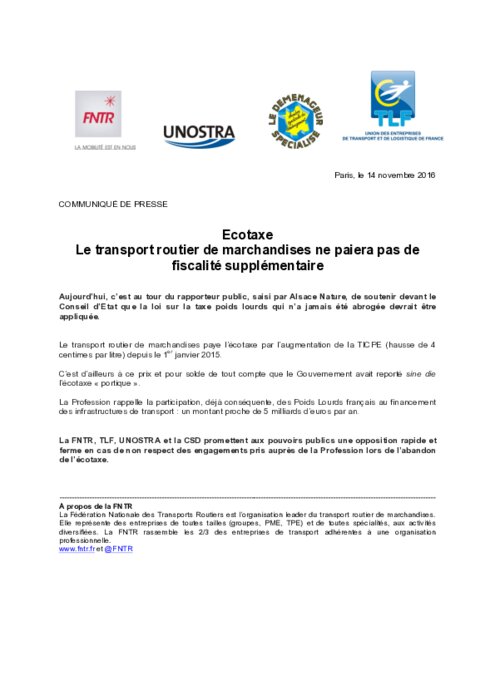 De son côté, la FNTR (Fédération nationale des transports routiers), dans un communiqué commun avec d'autres organisations du secteur (Unostra, TLF et CSD), a souligné que l'écotaxe, feuilleton lancé en 2007, avait été reporté sine die "pour solde de tout compte" en octobre 2014 par la ministre de l'Environnement Ségolène Royal.