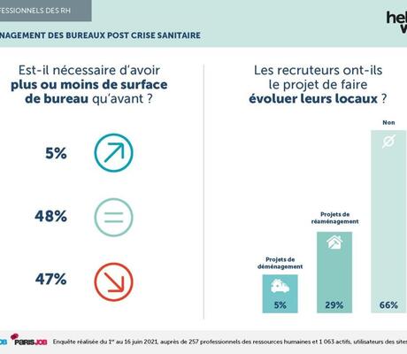 « 15 mois après le début de la crise sanitaire, et au lendemain d’un nouveau déconfinement qui précède la période estivale, le retour au bureau ne fait pas l’unanimité. Le télétravail reste la tendance puisque la majorité des Français souhaite continuer à travailler à distance. Concernant les bureaux, cette période post-crise amènera certainement les entreprises à revoir leurs besoins. Pour l’instant notre sondage montre qu’un tiers des DRH a déjà des projets de réaménagement de leurs bureaux ou de déménagement suite à la crise sanitaire et son impact sur les modes de travail. Un consensus de mix présentiel/distanciel semble se dessiner, pour tirer profit du meilleur des deux pratiques ; avec des salariés qui souhaitent du télétravail mais veulent tout de même conserver un bureau et des recruteurs qui acceptent un à deux jours par semaine » déclare David Beaurepaire, Directeur délégué de HelloWork.