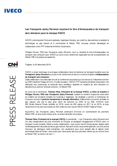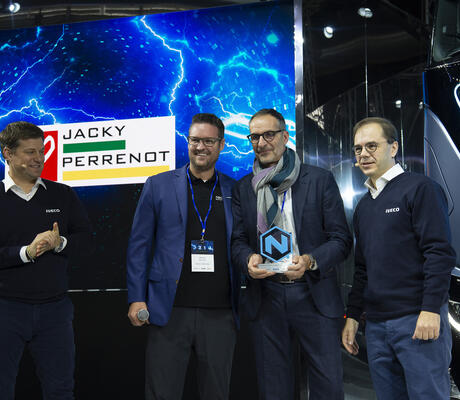 IVECO a récompensé l’innovant opérateur logistique français, qui a été l’un des premiers à adopter la technologie au gaz naturel et à commander le Nikola TRE, nouveau camion développé en collaboration avec FPT Industrial et Nikola Corporation. Philippe Givone, PDG des Transports Jacky Perrenot, s’est vu remettre le titre d’Ambassadeur du transport zéro émission pour IVECO au cours d’une cérémonie organisée lors de la présentation du Nikola TRE à la presse européenne.